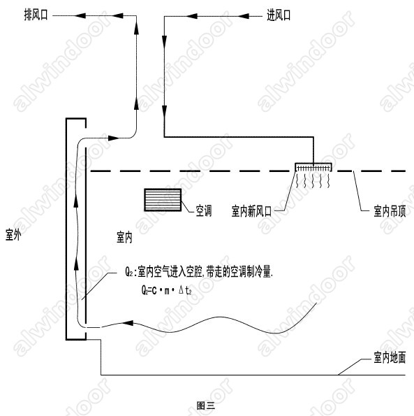 1.直排式內(nèi)循環(huán)雙層幕墻在夏季室外炎熱高溫時(shí),室內(nèi)要達(dá)到舒適的溫度環(huán)境,通常采用空調(diào)制冷降溫,如圖三。按直排式內(nèi)循環(huán)雙層幕墻的空氣循環(huán)路線可以看到,室內(nèi)被空調(diào)降溫的空氣在排出室外的過程中帶走了空調(diào)的制冷能量。夏季室外高溫空氣作為新風(fēng)進(jìn)人室內(nèi)時(shí)不得不增加空調(diào)的負(fù)荷,所以直排式內(nèi)循環(huán)雙層幕墻在夏季與其它選用相同