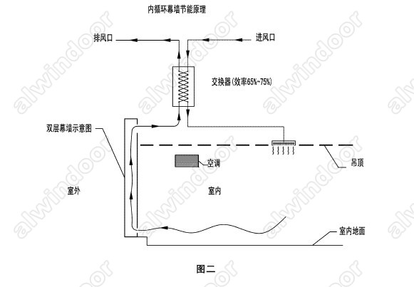 內(nèi)循環(huán)雙層幕墻分類方法很多,這里不贅述。從是否具有節(jié)能功能的專業(yè)角度來說,內(nèi)循環(huán)雙層幕墻應(yīng)分為直排式內(nèi)循環(huán)幕墻和交換式內(nèi)循環(huán)幕墻兩大類。圖一是直排式內(nèi)循環(huán)幕墻工作原理示意圖。圖二是交換式內(nèi)循環(huán)幕墻工作原理示意圖。直排式內(nèi)循環(huán)雙層幕墻工作原理是室內(nèi)氣體經(jīng)圖示線路從雙層幕墻進(jìn)氣口(下口)進(jìn)人雙層內(nèi)腔,從幕墻上面出口進(jìn)人排風(fēng)管道排出建筑外部。排風(fēng)動(dòng)力裝置通常采用專用的軸流風(fēng)機(jī)或其它滿足設(shè)計(jì)要求的排風(fēng)機(jī)。內(nèi)循環(huán)雙層幕墻靠自然通風(fēng)往往效果不佳。室內(nèi)需要的新風(fēng)通過建筑立面上專