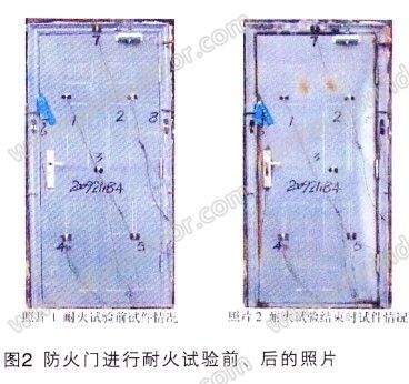 現在我國在實際工程中經常使用的三個等級的防火門——A0.05(丙級)、A1.00(乙級)、A1.5O(甲級),其耐火性能的確定方法與圖1所示的過程類似。圖2是我國一個防火門在進行耐火試驗前、后的照片。從圖中可看到,防火門的框、扇上有多個溫度測量點。這些測量點要按GB/T7633《門和卷簾的耐火試驗方法》的規定進行布置。試驗時,在門的一側按GB/T9978.1《建筑