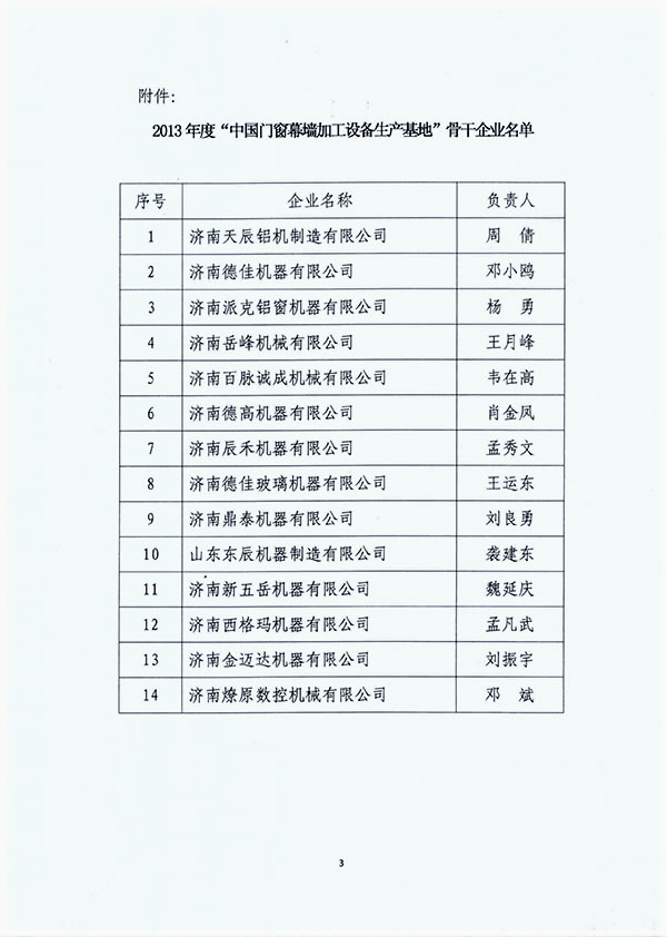 關(guān)于公布2013年度“中國(guó)門窗幕墻加工設(shè)備生產(chǎn)基地”骨干企業(yè)名單的通知