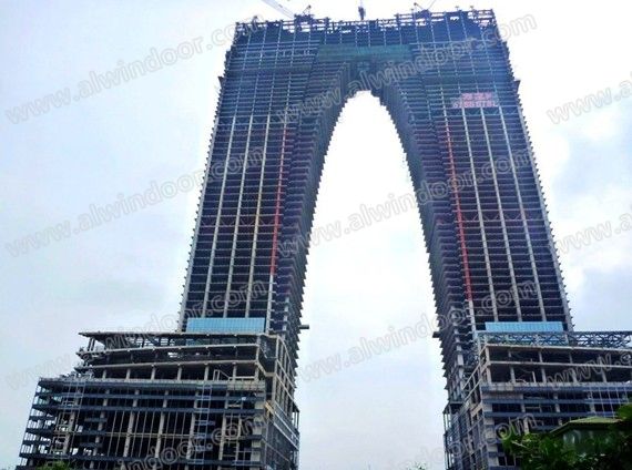 廣東西塔是全世界目前最大的隱框幕墻,也是全世界的最高的隱框幕墻。廣州西塔幕墻非常龐大,最大的板塊約6米左右。如此巨大的板塊完全用結構密封膠來粘貼確實讓人有些疑慮,而且幕墻建筑高度達432米,已經也超出了102規范的使用范疇,同時也出過了硅酮結構密封膠的國家標準的使用范圍。所以對該工程由建設部標準定額司特別召開了一個標準行政許可會。對超出標準規定的隱框玻璃幕墻使用的硅酮結構密封膠進行了一個專門的研究,同時做了大量的實驗。最后使用“廣州白云”高強度密封膠制做全隱框幕墻,目前的使用非常良好。幕墻工程由深圳金粵幕墻公司施工。