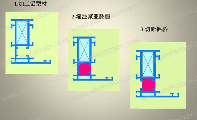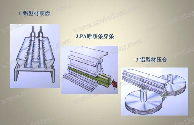 鋁合金型材由兩種不同的工藝形成兩種型材。(1)穿條式鋁合金型材,先將鋁型材滾齒,再將PA斷熱條穿條,最后鋁型材壓合。(2)澆注式鋁合金型材,先加工鋁型材,再灌注聚亞胺脂,最后切斷鋁橋。