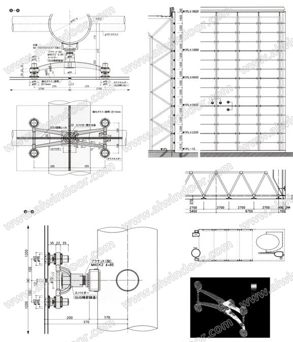 該幕墻的玻璃尺寸H1200×W2700,根據DPG構法,以此確定為框形幕墻。這是一個主要以鋼管施工的幕墻,總面積3340㎡,覆蓋建筑南側,北側主面,東側的大約1/3。YKKAP根據此工程以品質保證,降低成本(包括玻璃、硅膠)為主線做了較好的設計。對平面內變形采用吸收自動調節構造,日本是一個地震多發國,因地震等會引起玻璃的頻繁活動,該幕墻通過軟聯接,把力吸收的辦法取得了很好的效果。根據日本標準通過實驗,耐震瞬間變形角1/100,抗風風壓2000pa,水密性1500pa等都已確認。該幕墻玻璃爪采用不銹鋼精密鑄造,用X字的變形狀玻璃爪支撐橫長的玻璃。材料通常為SUS304,此工程為防銹采用更強的SUS316,建筑鋼件的加工技術和經濟性,來自德國的加工廠制作。強度為15㎜的玻璃制作,設計者以低價格,獨特的透明感為意向,通過與法國三高邦公司訂貨,解決了在歐洲幾乎在施工中不使用的防止飛散膠片貼粘加工方法,在新加坡通過YKK進行了施工,取得了成功。對于150米長的建筑物,考慮到工期縮短和經濟性,在施工組織設計中采用構造施工與屋頂外裝組合一起施工完成。在一個間隔完成后,采用橫向移動法來提高效率。在實際施工中,他們根據施工方向制作了相應的工具,來提高幕墻施工精度和速度。該工程是YKKAP承擔的工程,工程從計劃到設計,后調試完好,共6個月。材料配件3個月,施工4個月完成。