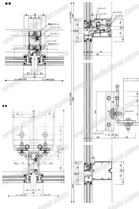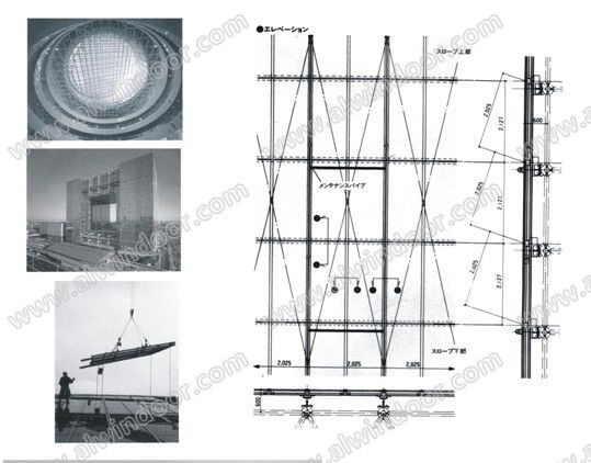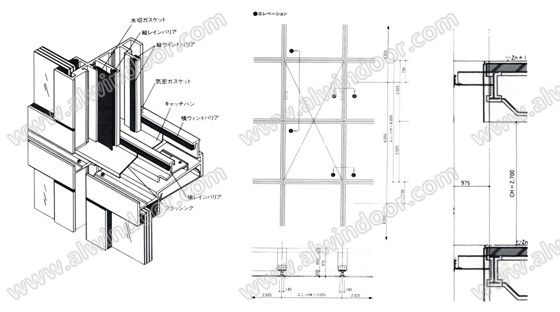 這座幕墻座落在東京都江東區(qū)青梅238號,由東京通信傳送中心建造。建筑物氣勢輝宏,正面入口的四周采用明框幕墻組成,中間是一個巨大的無墻空間,整個幕墻運用連鎖密封式單元幕墻的形式結(jié)構(gòu)。 門中央有140㎜的水溝槽。突出正面格子樣式,外部露出的鋼架連結(jié)構(gòu)造體,貫通幕墻整個玻璃面的設(shè)計。板塊W2025×H4050為基本定格尺寸,板塊間隙縱、橫部用橡皮條,采用連鎖密封法。如此具大的幕墻,考慮到施工性,其板塊接縫部采用硅膠發(fā)泡襯,它是用密封干燥法成形的部品,在現(xiàn)場進行施工的。幕墻與鋼結(jié)構(gòu)連結(jié)內(nèi)部露出的鐵腳極為緊湊,由簡單形狀組成的鐵腳予以聯(lián)接貫通。由于采用單元幕墻的形式結(jié)構(gòu),大大提升了工程進度和施工質(zhì)量。