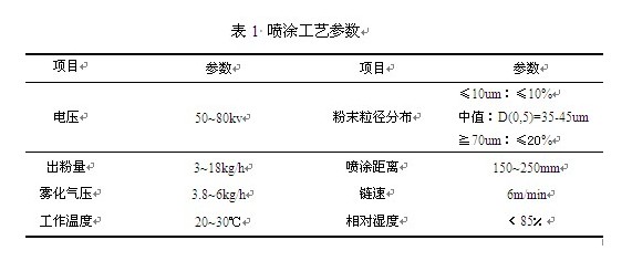 按設計配方稱取各組分,萬能中藥粉碎機充分預混合完畢后通過雙螺桿擠出機在設定溫度下進行熔融擠出,擠出片料經冷卻、粉碎、過篩、靜電噴涂、熱固化成膜,最后對涂膜進行性能測試。噴涂工藝參數如表1所示: