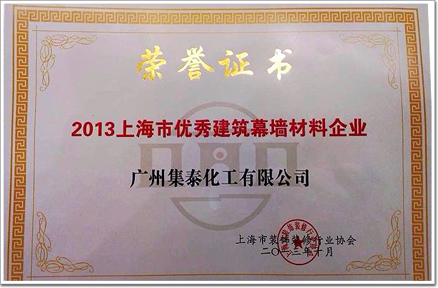 廣州集泰化工有限公司獲得“2013上海市優秀建筑幕墻材料企業”的榮譽稱號