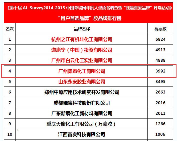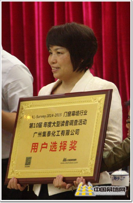 安泰結構膠自去年11月入圍第十屆AL-Survey(詞條“AL-Survey”由行業大百科提供)門窗幕墻大型讀者調查活動以來,倍受廣大行業讀者和用戶的青睞,通過三個多月的網上票選和專家評審,最終以3983票,榮獲“市場表現獎”、最終以3992票,榮獲“用戶首選品牌”獎。