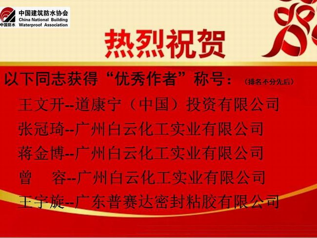 在日前結(jié)束的2015年中國建筑防水協(xié)會密封材料分會年會暨第六屆密封材料技術(shù)研討會上,廣州市白云化工實業(yè)有限公司技術(shù)總監(jiān)張冠琦、高級工程師蔣金博和曾容三位技術(shù)骨干被密封材料分會評為“優(yōu)秀作者”,并受到表彰!
