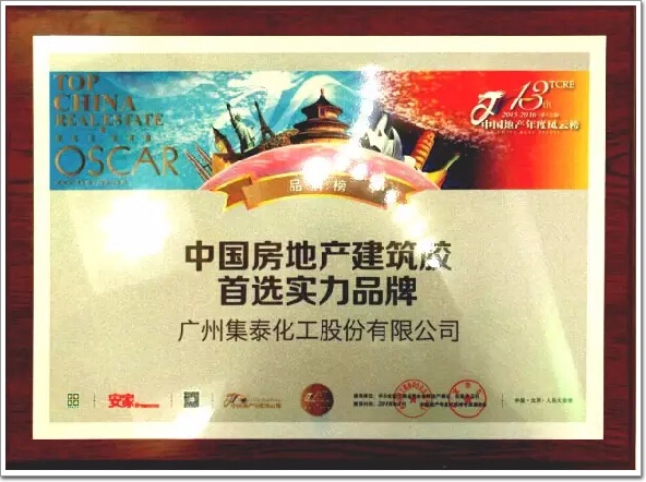 1月22日,素有中國“地產奧斯卡”之稱的中國地產年度風云榜(2015—2016第十三屆)在北京人民大會堂盛大啟幕。本次盛會上,廣州集泰化工股份有限公司榮獲“中國房地產建筑膠首選實力品牌”獎,也是在此次盛典中唯一獲獎的建筑膠生產企業。