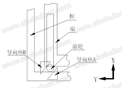 該系統(tǒng)中的開(kāi)啟裝置如圖10所示意,開(kāi)啟裝置由兩部分組成,分別為安裝在框上的導(dǎo)向座A、B和安裝在扇上的滾輪,滾輪與傳動(dòng)器連接。系統(tǒng)關(guān)閉時(shí),轉(zhuǎn)動(dòng)執(zhí)手至最大行程,滾輪將與導(dǎo)向座A接觸,導(dǎo)向座A將迫使?jié)L輪帶動(dòng)活動(dòng)扇B沿Y方向運(yùn)動(dòng)(配合豎直鎖閉組同步進(jìn)行),直至活動(dòng)扇B運(yùn)動(dòng)到鎖閉位置;系統(tǒng)開(kāi)啟時(shí),反向操作執(zhí)手至第一個(gè)行程結(jié)束,滾輪將保持不動(dòng),此時(shí)活動(dòng)扇B也保持不動(dòng)并將活動(dòng)扇A彈開(kāi),再操作執(zhí)手至第二個(gè)行程結(jié)束,此時(shí)滾輪將退出導(dǎo)向座A并與導(dǎo)向座B接觸。導(dǎo)向座B迫使?jié)L輪帶著活動(dòng)扇B沿Y方向反向運(yùn)動(dòng),并將活動(dòng)扇B相對(duì)于框推開(kāi)一定的距離,消除框扇之間的摩擦力,便于開(kāi)啟順暢。