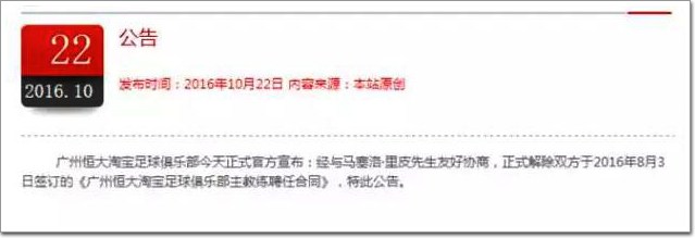 據了解,今年8月3日恒大與里皮簽了合同,聘任其擔任恒大隊下賽季主帥,因此,里皮若赴國足出任主帥,則需要恒大放手,這將讓恒大陷入被動狀況,但現已眾所周知,10月22日17點剛過,恒大官網即公布了一條消息,宣布與里皮簽訂的下賽季執教合約正式解除。隨后,中國足協宣布正式聘用意大利名帥里皮出任中國男足主教練。