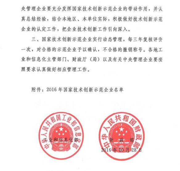 為深入貫徹實施創新驅動發展戰略,根據工業和信息化部、財政部制定的《技術創新示范企業認定管理辦法(試行)》(工信部聯科〔2010〕540號),經審核,2016年國家技術創新示范企業名單已確定,現予公布。有關事項通知如下: