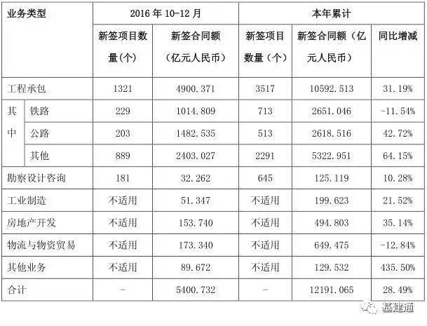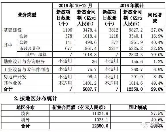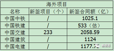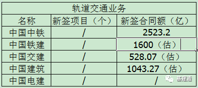 2016年中國(guó)中鐵鐵路業(yè)務(wù)新簽合同額1261.9億,中國(guó)鐵建2618.516億,中國(guó)交建1349.46億,中國(guó)建筑根據(jù)估算有2168億,中國(guó)電建中標(biāo)項(xiàng)目估算為17個(gè)。