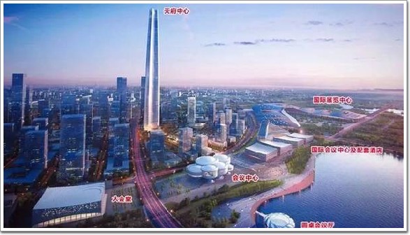 項目位于成都天府新區秦皇寺,因此大廈命名“天府中心”,計劃投資200億建設,占地約494畝,建筑總體量高達210萬平方米,包含城市地標天府中心、配套總部商務辦公建筑群和生態智慧社區等。而在其中,天府中