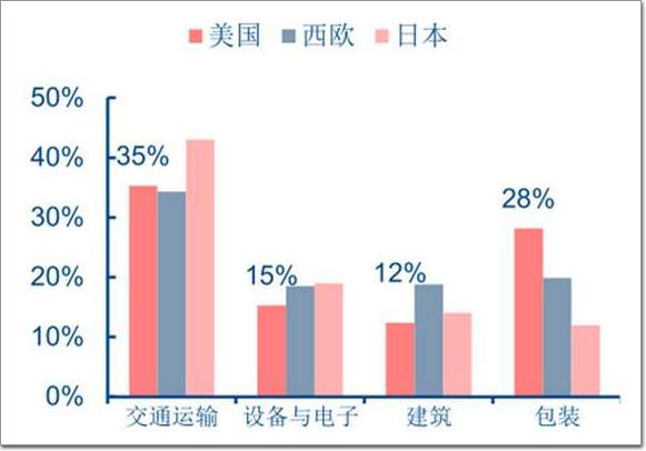 高端鋁材消費正在大幅上升。雖然我國是全球鋁材第一大消費國,但從消費結構上與歐美發達國家存在較大差異。建筑業是我國鋁材最大應用領域,占比 33%,其次是交通,電力、包裝、機械制造、耐用消費品和電子通訊,分別占比 21%、12%、10%、8%、8%和 4%。而以美國為例,交通運輸是第一大用鋁領域,占比 39%,而建筑領域占比為 25%,包裝領域占比為 16%。