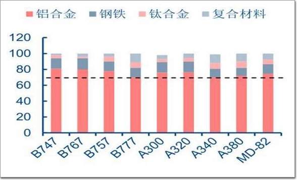 高端鋁合金材料的比強度和比剛度(詞條“剛度”由行業大百科提供)與鋼相似,但密度更小,同樣強度水平下可提供截面更厚的材料,受壓時的抗屈曲能力更佳,成為經典的飛機結構材料。高強鋁合金具有密度低、強度高、熱加工性能好等優點,其制成的板材、擠壓型材、轂件等在航空航天構件上有廣泛的應用前景。比如高強鋁合金厚板作為主要承力構件,使用比例占飛機上總鋁材用量的30%-35%,民用干線飛機鋁材比例達到 70%以上。