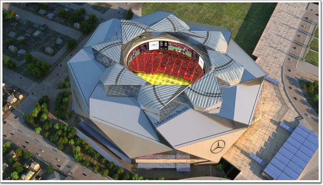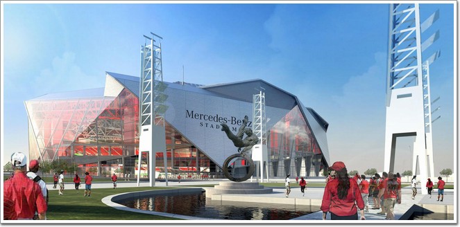 梅賽德斯-奔馳體育館是由梅賽德斯奔馳公司在亞特蘭大為亞特蘭大獵鷹橄欖球隊設立的體育館, 外形看起來也像是飛翔的獵鷹, 該體育場同時也將是亞特蘭大足球俱樂部的主場。亞特蘭大獵鷹隊下賽季會搬進價值15億的梅賽德斯奔馳球場,奔馳同意30年內向獵鷹支付3億4500萬獲得冠名權。球場耗資巨大, 標志著美國體育場建設的未來方向。