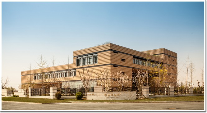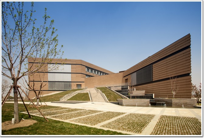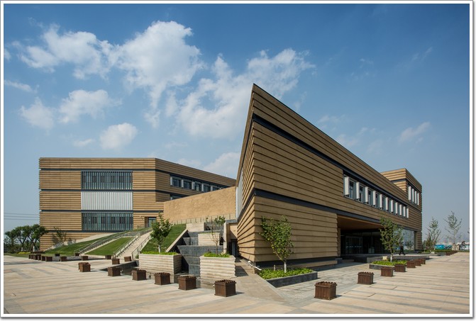 項(xiàng)目位于天津塘沽灣,建筑面積9908平方米,于2015年竣工投用。為應(yīng)對環(huán)境與氣候的不同立面,建筑體量生成從環(huán)境風(fēng)、光、生態(tài)要素出發(fā),并進(jìn)一步應(yīng)對不同朝向選擇不同的立面處理:南側(cè)是簡潔帶形窗和玻璃幕墻,東側(cè)深凹的灰空間提供了室外空間并引導(dǎo)了夏季風(fēng),北側(cè)大面實(shí)墻上開設(shè)了不規(guī)則的窗洞,而西側(cè)45°的實(shí)墻環(huán)抱著傾斜草坡將西側(cè)公園引向建筑二層平臺。