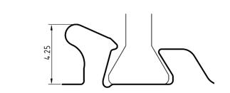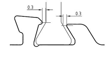 槽口的外部尺寸中最重要的一個數(shù)據(jù)是外夾頭高度,行業(yè)推薦的是3.5mm,這也是歐洲近四十年使用經(jīng)驗的結(jié)晶。當(dāng)然也可以做如圖9所示的槽口,有意將外夾頭尺寸加大,這樣可以減小滾壓時的滾壓力,因為滾壓力的力臂加大了;或者在同樣的滾壓力下,隔熱鋁型材的外夾頭與隔熱條咬合的更緊密了。但不利之處是:如果使用的是C型條或其他的異性條,有可能會出現(xiàn)外夾頭與隔熱條磕碰的情況(如圖10所示)。所以建議如果一定要加大外夾頭尺寸時,要盡量避免出現(xiàn)磕碰。