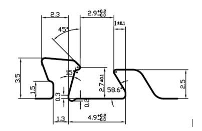 如果鋁型材槽口的開口尺寸小于2.9mm,將使得滾齒后鋁型材槽口與隔熱條之間的間距要小于0.3mm,這時穿條將比較困難。如果此時隔熱條的誤差是正誤差的話,極有可能導(dǎo)致不能穿條的情況出現(xiàn)。如果鋁型材槽口的開口尺寸大于2.9mm時,將使得滾壓時外夾頭的行程加大,影響外夾頭與隔熱條的咬合;如果大于3.1mm時,滾壓是外夾頭的行程過大,可能會導(dǎo)致外夾頭開裂。