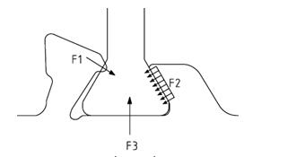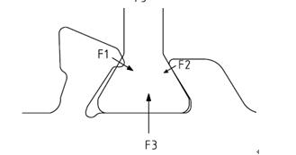 其次是內(nèi)夾頭斜角,行業(yè)推薦的是58.6°。隔熱鋁型材槽口內(nèi)夾頭是為了隔熱條能夠垂直就位于鋁型材槽口中,并在滾壓中起支撐隔熱條的作用。由圖2我們知道隔熱條頭部的斜角是60°,因此有人可能要問:既然隔熱條與隔熱鋁型材的槽口是相互配合的關(guān)系,那么隔熱鋁型材槽口的內(nèi)夾頭斜角為什么是58.6°,而不是60°?這是因為如果隔熱鋁型材槽口內(nèi)夾頭斜角是60°的話,在隔熱鋁型材滾壓時,隔熱條靠內(nèi)夾頭一側(cè)應(yīng)該是要與內(nèi)夾頭緊密貼合的,這樣在這個位置上隔熱條受到的是線荷載,而滾壓時外夾頭給予隔熱條的是一個集中力(見圖5),這樣就力矩而言是一個不平衡的體系,使得滾壓時就有隔熱條受扭開裂的情況或隱患出現(xiàn);而隔熱鋁型材內(nèi)夾頭斜角是58.6°的話,在隔熱鋁型材滾壓時,由于傾斜角度的不一樣,隔熱條受鋁型材內(nèi)夾頭上部的阻擋,使得隔熱條靠內(nèi)夾頭一側(cè)(除內(nèi)夾頭上部外)能夠非常接近但不能緊密貼合,因此同外夾頭一樣給予隔熱條的是集中力(見圖6),這樣不論是受力狀況還是力矩,都是一個平衡的體系。所以減小了因為受力的不平衡而存在的隔熱條開裂的隱患。
