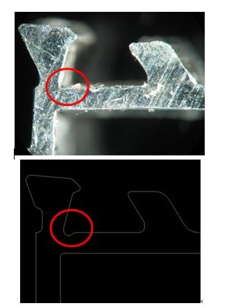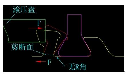 再次是內(nèi)倒圓弧角,在隔熱鋁型材槽口處還要注意的是外夾頭處的內(nèi)倒圓弧角問題。因為在滾壓過程當(dāng)中,隨著外夾頭與隔熱條咬合,外夾頭根部位置是里邊受壓變形,會造成此處材料堆積,這樣就必然要預(yù)留位置來堆積這些材料。如果在鋁型材槽口中出現(xiàn)內(nèi)倒圓弧角缺失的現(xiàn)象(如圖7),在滾壓過程中就勢必會造成外夾頭內(nèi)跟部位置受壓的鋁材(詞條“鋁材”由行業(yè)大百科提供)沒有位置堆積,只能向槽口內(nèi)側(cè)突出,如果要使外夾頭同樣程度的插進隔熱條,就必然要增大滾壓力。這樣增大滾壓難度不算,還有可能造成的后果會有兩種:其一是滾壓力過大,使得外夾頭在根部出現(xiàn)斷裂的現(xiàn)象(如圖8所示);其二是堆積在外夾頭根部的鋁材經(jīng)過一段時間以后,其內(nèi)應(yīng)力得到釋放,使得外夾頭不能緊緊的咬合在隔熱條內(nèi),從而降低隔熱鋁型材的機械性能,特別是縱向剪切特征值。