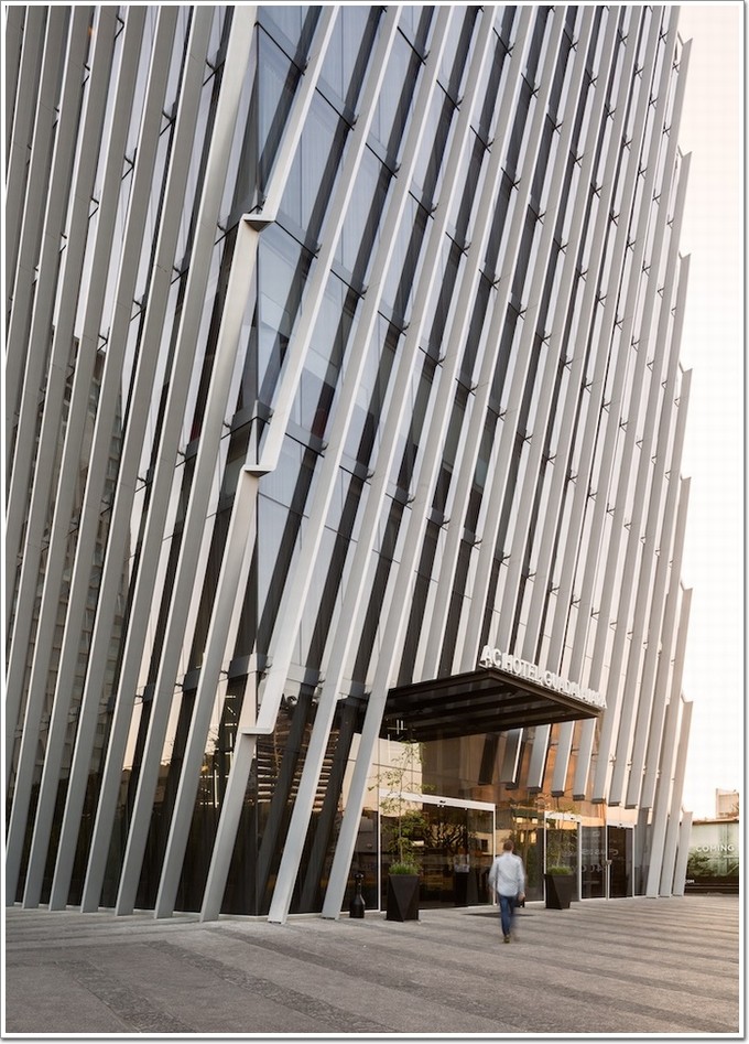 設計過程中最大的挑戰是建筑的四個外立面中有三面都有強烈的光照,為了保證建筑內部均勻的光照條件,設計團隊采用嵌入式鋁框架。最外側的鋁制結構有著特殊設計的角度,以創造恰到好處的陰影,避免建筑內部聚集過量的光線和熱量,這是使整座大樓外形變得特別的一大重要元素。