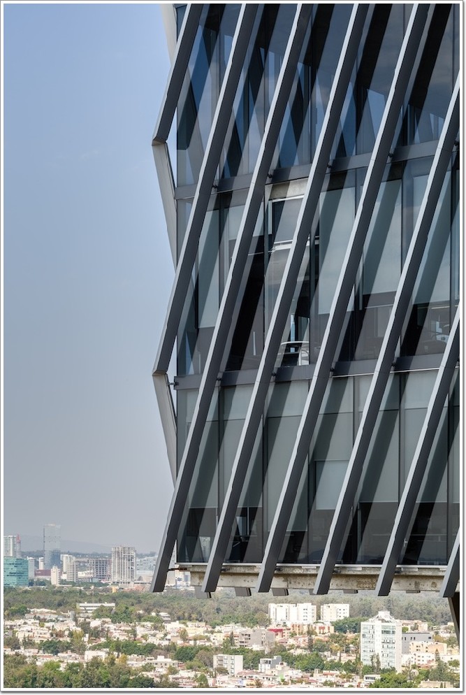 托雷美洲大道1500是整體建設發展的第一個階段。第一個階段占地4116平方米,建筑面積29461平方米,從一層的公共空間到最高層的辦公區域一共26層樓,最頂上有直升飛機停機坪。地下還有7層,建筑面積為28509平方米。建筑整體的結構設計則是在預應力混凝土板和位于中央循環系統的核心的基礎上進一步發展。