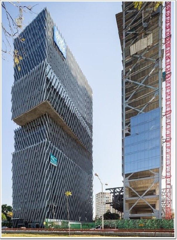 該項目于2017年落成,占地面積約5.8萬平方米,建筑規整的外貌由四個疊在一起的幾何形體組成,看上去像是由四個方盒子不規則的堆砌而成。這個概念源自于它本身混合功能性質的需求。從正面看,建筑中的兩個體塊與大體積錯位,而在反面,這四個體塊則連為一線。這個將讓不同體塊錯位的設計使得這棟建筑沒有一般高樓的厚實感,不穩定性是為了打破建筑呆板、穩固的外表,增加一抹優雅的運動感,同時還表達出一種優雅的美。整個建筑的底部空間是用作酒店客房,而在其之上的三個辦公用的體塊則由三個不同企業分別占據。