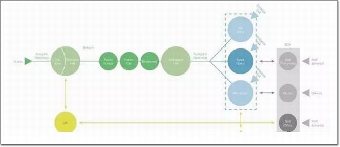 規劃方案以一個露天廣場為核心,由三個展區圍繞而成,每個展區有各自的主題——“可持續性”“流動性”和“機遇”。同時,設計采用了“光電(詞條“光電”由行業大百科提供)纖維結構”,通過一個巨大的太陽能電池板來連接三個主題展區。大型展館分布在光電板內側,小型展館分布在光電板外側,參觀路線清晰。