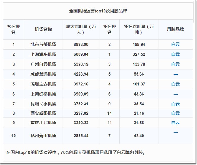 不僅如此,廣州白云國際機場,深圳寶安國際機場,長沙黃花國際機場,武漢天河國際機場,重慶江北國際機場,鄂爾多斯國際機場,烏魯木齊地窩堡國際機場,成都雙流國際機,鄭州新鄭機場,庫爾勒機場,阿勒泰機場,漠河古蓮機場,西藏日喀則和平機場,濟寧曲阜機場,臺州路橋機場,汕頭外砂機場,博鰲機場,及部分國家軍用機場……從南到北、從東到西,80多個機場跑道使用了白云硅酮道路密封膠。