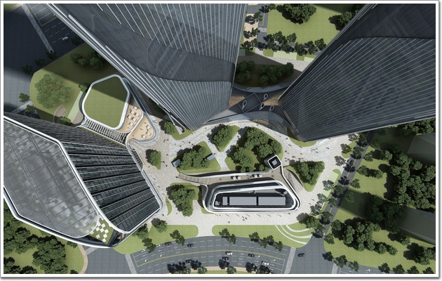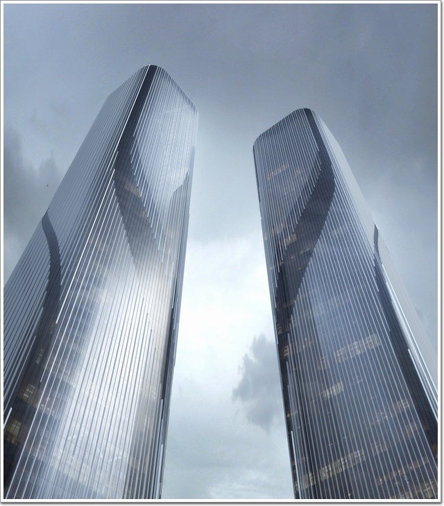 該項(xiàng)目與美國(guó)著名的結(jié)構(gòu)顧問(wèn)公司LERA合作,采用巨柱與斜向支撐的高效結(jié)構(gòu)體系,為了效率最大化以及實(shí)現(xiàn)其纖細(xì)的形態(tài)進(jìn)行結(jié)構(gòu)優(yōu)化,目的當(dāng)然是為得到美國(guó)LEED綠色建筑認(rèn)證,雙塔采用具有遮陽(yáng)功能的鋁散熱高效能玻璃幕墻,可以同時(shí)減少眩光和太陽(yáng)熱輻射。
