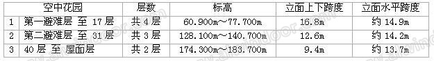 本工程外立面形式較為規整,采用單元式玻璃幕墻(詞條“單元式玻璃幕墻”由行業大百科提供)系統。空中花園區域為跨層的共享空間,單元幕墻板塊不能直接安裝在中間樓層的土建結構之上,需要專門設計出大跨度的支承體系,在滿足建筑效果要求的同時,又能為超高層的單元玻璃幕墻提供結構支承。