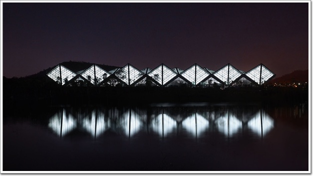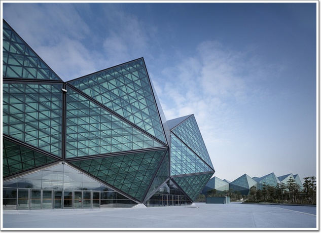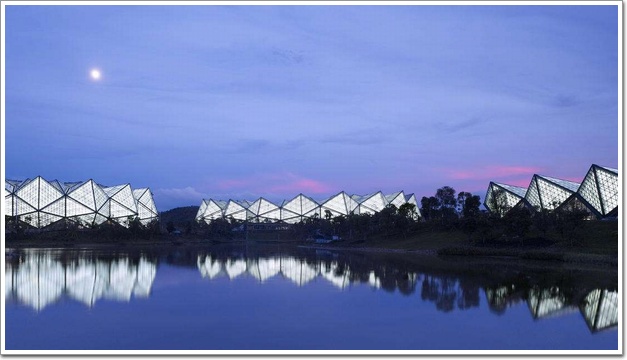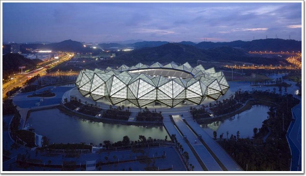 大運中心三大場館建筑造型為三座水晶結構,所有場館通過一個人工湖相互聯系,并把現存的銅鼓嶺山體引入延伸至大運中心內部,構成山、水、石獨特的設計理念。大運中心設計新穎,采用了許多新理念、新技術、新工藝,其綠色環保節能的設計理念涵蓋在設計之中,外立面采用PC板、PTFE膜,XIR夾膠玻璃、體育館輕質聲學復合板,這種材料具有質輕,集吸音、隔聲、防火及隔熱等功能于一體。而館內的主要建材、設備運動器材均應用了國際先進的技術和材料建造,從而為運動員比賽訓練及群眾健身提供健康環保的優良環境和條件。