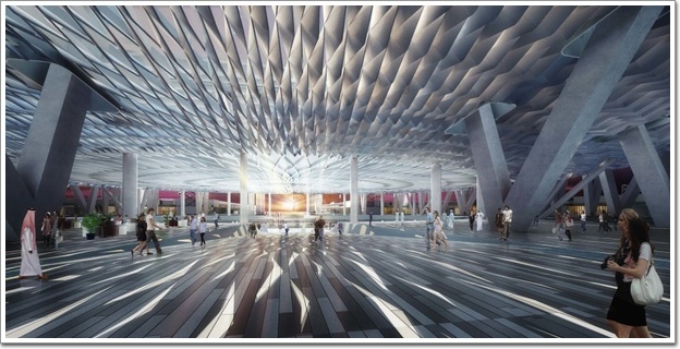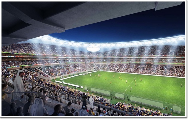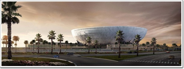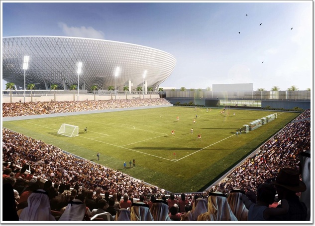 項目為了使結構占地最小的空間,在下方創建一個陰影入口廣場,體育場地被抬高了距的地面60英尺。帶有傾斜角度座位的碗狀體量從平面上升,由圓形陣列的V形柱支撐。整個結構被包裹在可滲透的立面之下,允許氣流通過,同時阻擋不必要的沙土和陽光。