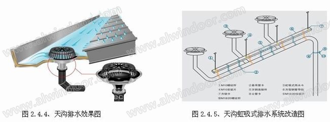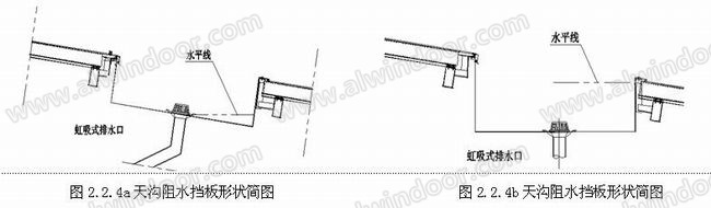 2.2.3、大坡度的排水天溝應(yīng)設(shè)置阻水擋板、水平落水斗: