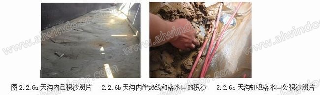 大部分屋面的天溝和檐溝都是裸露在外的,對于室外的粉塵、風(fēng)沙和風(fēng)中的夾雜物隨著雨水或自重會進入到天溝內(nèi)。特別是在風(fēng)沙大的地區(qū)這個問題就顯得十分嚴(yán)重,就連有蓋板的天溝都會被積沙、積塵侵入,如不能及時清理積沙會將全部排水口封住,特別是對虹式排水口的功能破壞非常嚴(yán)重。(如圖2.2.6a、b、c)