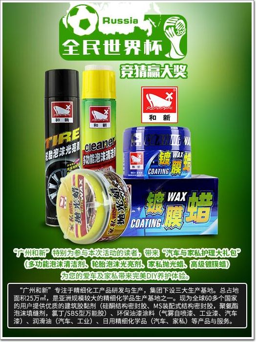 “和新”汽車與家私護理大禮包:炎熱夏日,世界杯如火如荼進行中,“和新實業”特別為參與本次活動的讀者,帶來“汽車與家私護理大禮包”(多功能泡沫清洗劑、輪胎泡沫光亮劑、家私拋光蠟,高級鍍膜蠟),為您的愛車及家私帶來完美DIY養護體驗。“廣州和新”專注于精細化工產品研發與生產,集團下設三大生產基地。總占地面積25萬㎡,是亞洲規模較大的精細化學品生產基地之一。現為全球60多個國家的用戶提供優質的建筑膠黏劑(硅酮結構密封膠(詞條“硅酮結構密封膠”由行業大百科提供)、MS裝配式結構密封膠,聚氨酯泡沫填縫劑,氯丁/SBS型萬能膠)、環保油漆涂料(氣霧自噴漆、工業漆、汽車漆)、潤滑油(汽車、工業)、日用精細化學品(汽車、家私)等產品與服務。
