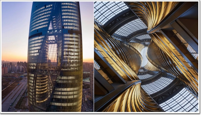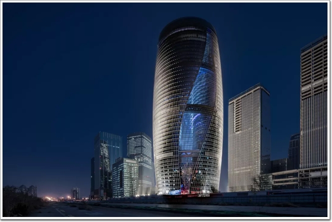 麗澤SOHO位于北京新豐臺的麗澤路,地處市中心與剛投入使用的大興國際機場之間,是正在崛起的經濟和交通樞紐。這是一座45層高、建筑面積為17.28萬平米的甲級寫字樓。由于麗澤SOHO地塊下方的地鐵連通線將整個地塊一分為二,因此建筑師創(chuàng)造性地設計了這座近200米的全球最高中庭解決了這一難題。DNA雙螺旋結構的流線型雙塔如同科幻場景,整個建筑鋼結構用量達1.83萬噸,相當于2.5個埃菲爾鐵塔。整樓高達194.15米,創(chuàng)造了世界上最高的中庭。該中庭隨著高度扭轉,使麗澤SOHO的兩部分樓體充滿韻律,宛如進行中的雙人舞,然后通過位于其間的天橋相連。透過中庭的玻璃外立面則可欣賞到城市的壯麗全景,為城市打造了一個夢幻的全新公共空間。