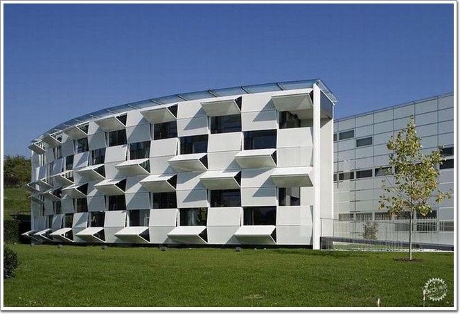 Ernst Giselbrecht + Partner事務所設計的Kiefer Technic Showroom是辦公和展覽空間,其幕墻改善了建筑的內部氣候。圖中信封式的結構由幾層材料制成,其中包括鋁柱、橫梁和由白色石膏包裹著EIFS立面(全稱:exterior insulation and finish system外部絕緣和完成系統,這里指外墻外保溫系統)。鋁板穿孔由電子操控,由此將建筑外觀從一個堅固的整體轉變為透明和封閉表面并存的有趣結合。