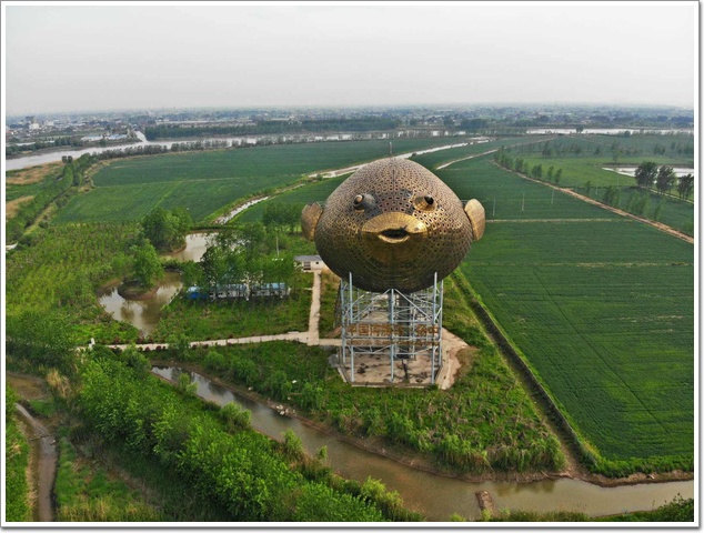 值不值這7千萬,姑且不論,小編先帶大家看看它究竟有何特別吧。該河豚塔位于江蘇省揚中市園博園的西沙島上,是第八屆江蘇省園博會的重要標志。巨型“河豚”距地面42米,相當于15層樓那么高,河豚長90米,寬44米,高62米,是對著河豚標本,按比例放大設計建造的。據悉,河豚塔目前是國內最大的異形鋼結構城市雕塑,體積則創下世界之最,該項目還申報了吉尼斯世界紀錄。
