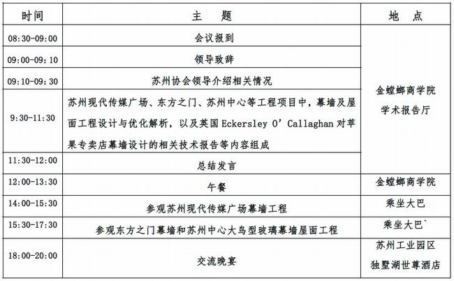 為便于行業同仁直觀而深入地了解這些建筑,加強幕墻顧問行業的技術進步與發展,中國建筑金屬結構協會門窗幕墻委員會、全國建筑幕墻顧問行業聯盟,決定于2019年6月5日,在蘇州舉行“2019全國建筑幕墻顧問行業聯盟觀摩活動”,屆時與會嘉賓將聽取蘇州現代傳媒廣場、東方之門(詞條“東方之門”由行業大百科提供)和蘇州中心大鳥型玻璃幕墻及屋面工程有關技術報告,并走進現場觀摩與項目分享,探尋印象古城中的現代建筑之美。同時,在活動期間還將分享來自英國Eckersley O’Callaghan,對蘋果專賣店玻璃幕墻設計的相關介紹。