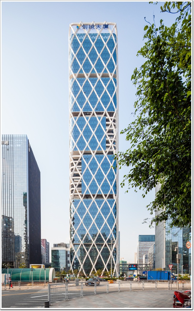 創投大廈的整體設計是結構體系和建筑功能空間設計的創新。本項目采用的結構體系為外交叉框架筒-內剪力墻核心筒鋼筋混凝土結構,這是一種類似筒中筒的結構體系,核心筒在包含了垂直交通和設備井道的同時,也起到了豎直承重的作用。