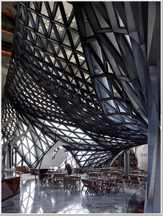 建筑外骨骼呈網狀結構,自由的三維曲面網格“包裹”著整個異形的玻璃體以及混凝土的核心部分,而鏤空的8字其實是連接兩棟樓的天橋。據悉,扎哈對這個項目傾注了全部的心血,甚至為了這個酒店開發了一款軟件,來模擬推演整個設計方案,只為了達到結構的最優化。