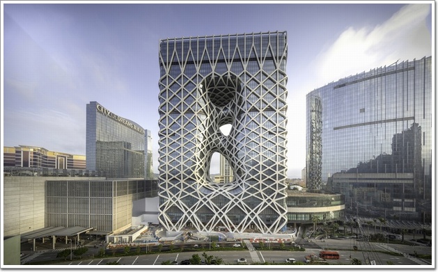 這間酒店,是全世界第一座采用自由形態鋼結構外骨架支撐的高層建筑,創造如此夢幻般的未來建筑,其設計難度與施工難度可想而知。大樓有著扎哈標志性的流暢線條,優美的曲線造型大膽又不突兀,中央設計有8字形鏤空部分,初看有點抽象甚至扭曲,卻增加了大樓的律動感,整座建筑讓澳門時髦的不像賭城。