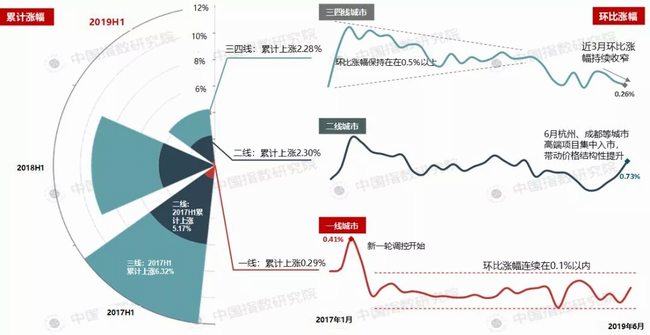 圖:2017年至2019年上半年各級城市住宅均價累計漲幅和環比漲幅對比