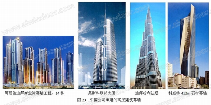 這十年,我國的幕墻走出了國門,邁向了世界。中國幕墻公司從加工出口、分包安裝到承包幕墻工程,到現(xiàn)在境外工程年總合同額超過百億元。我們不僅完成了國外許多高層建筑和公共建筑的幕墻工程(圖23、圖24),而且像迪拜哈里法塔這樣高度達(dá)828米,幕墻工程量達(dá)8 億人民幣的世界第一高玻璃幕墻,也是由中國公司完成。