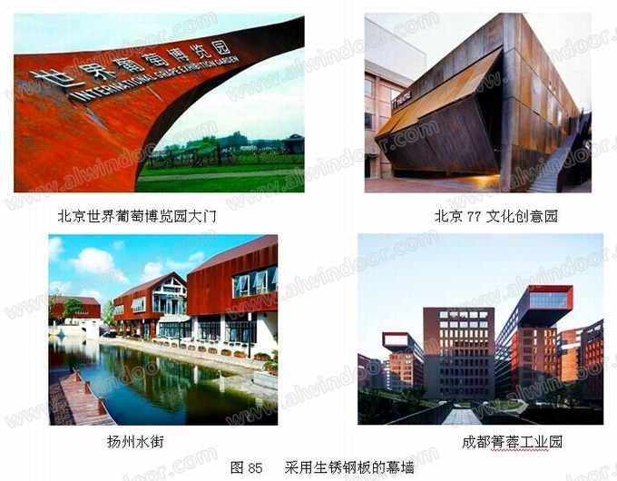 鋼板防銹是幕墻工程一個難題,最近建筑師反其道,采用生銹鋼板作為幕墻面料,取得新穎的效果(圖85)。