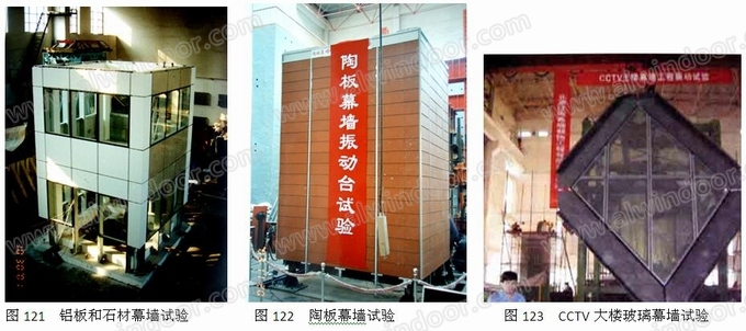 振動臺試驗(yàn)是研究幕墻抗震性能最直觀、最真實(shí)的試驗(yàn)方法。我國最大的振動臺臺面已經(jīng)達(dá)到6米X 6米,載重60噸。進(jìn)行過很多幕墻的振動臺試驗(yàn),其中包括幕墻的形式實(shí)驗(yàn)和對特定工程項(xiàng)目的幕墻試驗(yàn)(圖121~圖123)。