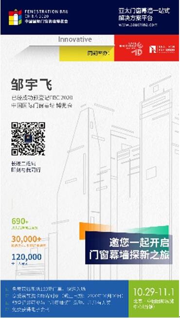 2020 FBC中國(guó)國(guó)際門(mén)窗幕墻博覽會(huì)熱忱歡迎您的到場(chǎng)參觀,聚焦十月,相約北京順義新國(guó)展!若需了解更多展會(huì)最新進(jìn)展及主題活動(dòng)詳情,歡迎登陸展會(huì)官方網(wǎng)站點(diǎn)擊查看 www.bauchina.com或掃描關(guān)注官方微信,讓我們相約FBC2020,發(fā)現(xiàn)產(chǎn)業(yè)未來(lái)!